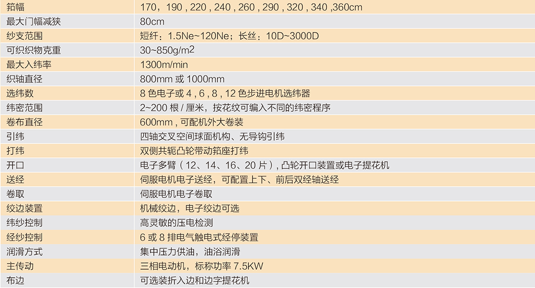 該機設計轉速700轉/分,最大入緯率1300米/分,筘幅范圍170~360厘米,不僅可織造各種服裝、裝飾面料,而且可織造輕型和中重型工業(yè)纖維和玻璃纖維。