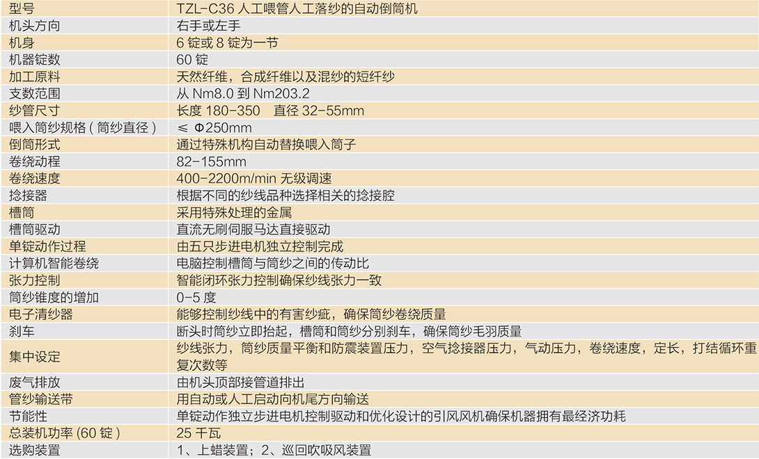 TZL-C36 自動(dòng)倒筒機是專(zhuān)門(mén)針對染紗加工企業(yè)所研發(fā)的設備,對染紗加工完成后的松式筒紗進(jìn)行緊式倒筒,同時(shí)適合氣流紡紗的成品紗進(jìn)行高精密清紗和分筒加工。